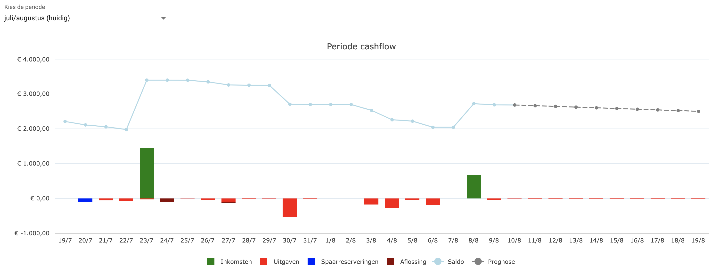 Op het dashboard zie je in één oogopslag hoe je ervoor staat in de lopende periode. Een visuele cashflowgrafiek toont wanneer het geld binnenkomt en wanneer het eruit gaat. De cashflow toont de stand van de rekeningen min de stand van de spaarpotjes. Als je de spaarpotjes op de spaarrekening zet (wat niet noodzakelijk is, maar wel aan te raden voor goed overzicht) is het dus het verloop van de (deels verwachte) stand van je betaalrekening in de periode.